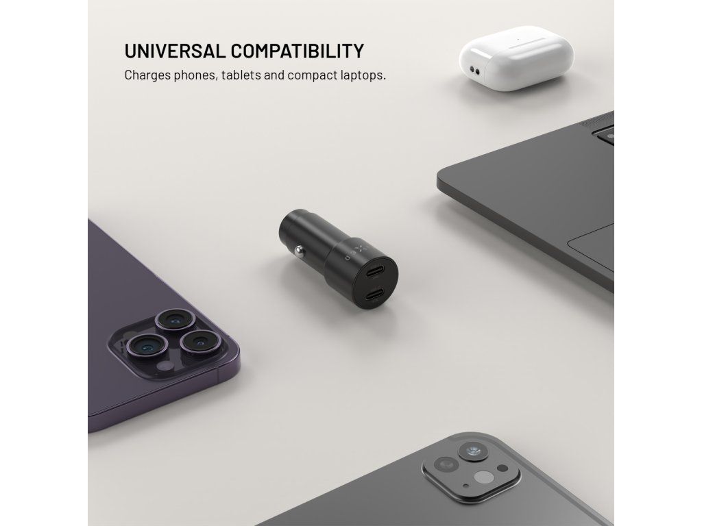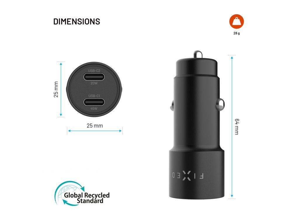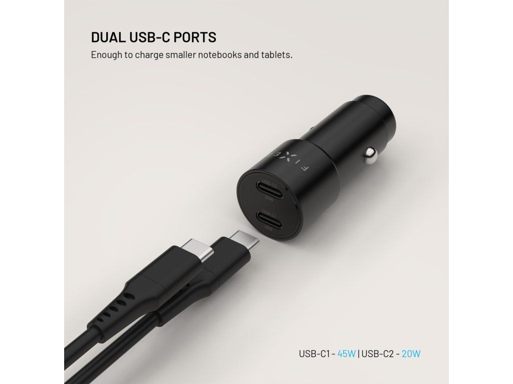 Výkonná autonabíječka FIXED v elegantním černém provedení je navržena pro efektivní nabíjení vašich zařízení přímo během jízdy ve vozidle. Díky dvěma USB‑C výstupům s celkovým výkonem až 65 W a podpoře Power Delivery 3.0 (PD 3.0) poskytuje rychlé a stabilní napájení moderním telefonům, tabletům i dalším zařízením.