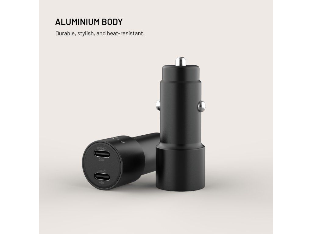 Každý z portů nabízí samostatné rozdělení výkonu – 45 W pro první USB‑C a 20 W pro druhý USB‑C, což umožňuje současné nabíjení dvou zařízení bez kompromisů v rychlosti. Kompaktní rozměry a odolné hliníkové tělo zajišťují, že nabíječka nenaruší vzhled interiéru vašeho vozu a je připravena sloužit při každodenním dojíždění i dlouhých trasách.
