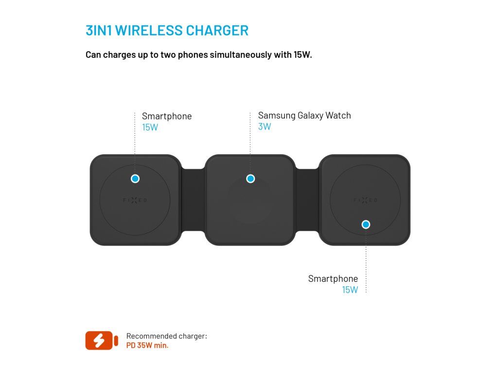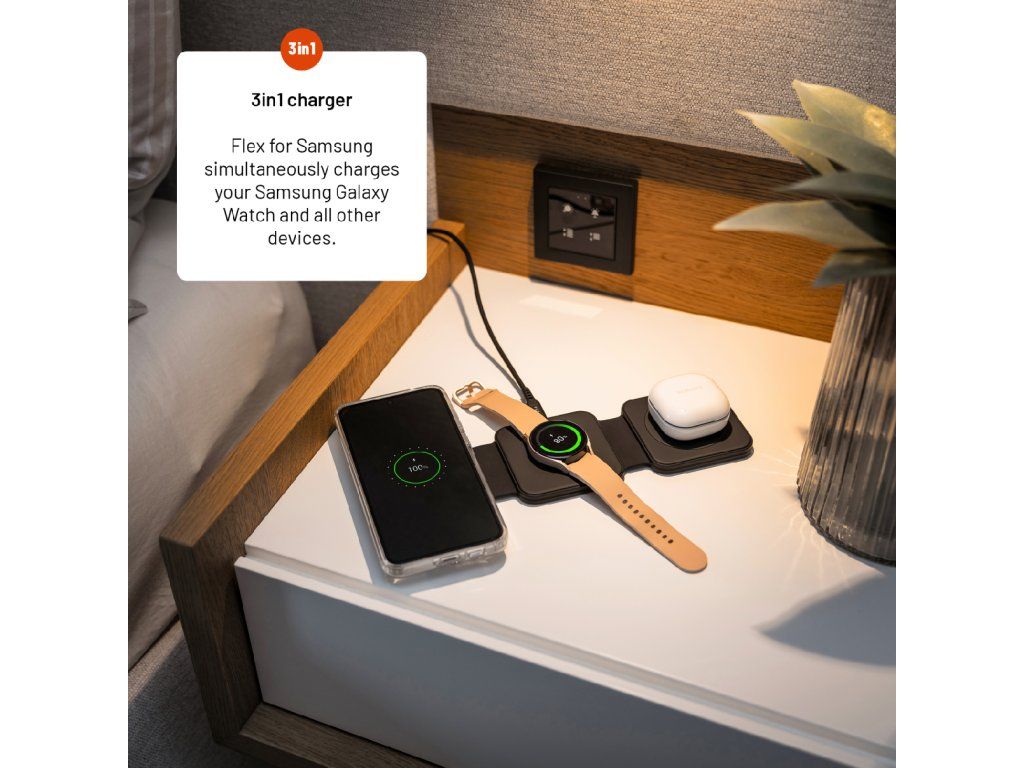 Bezdrátová nabíječka FIXED Flex 3v1 je praktické řešení pro uživatele zařízení Samsung, kteří chtějí nabíjet více zařízení současně a bez zbytečných kabelů. Umožňuje současné nabíjení až tří zařízení – typicky telefonu, sluchátek a chytrých hodinek – v jednom kompaktním a přehledném provedení.