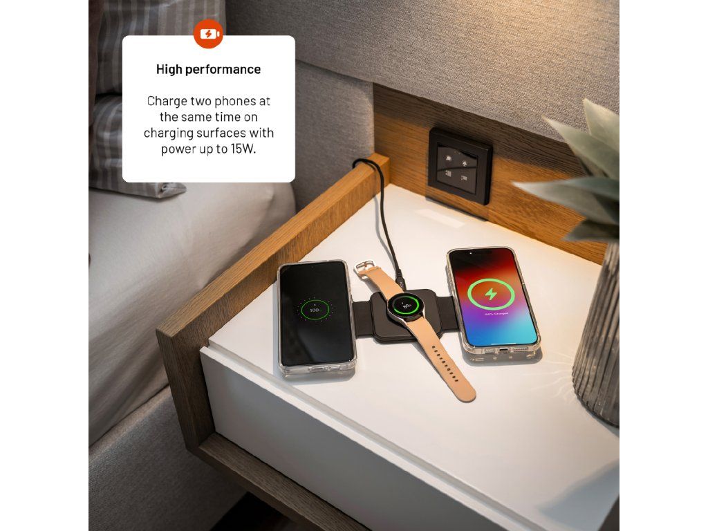 - Nabíjení 3 zařízení současně – telefon, sluchátka i hodinky v jednom