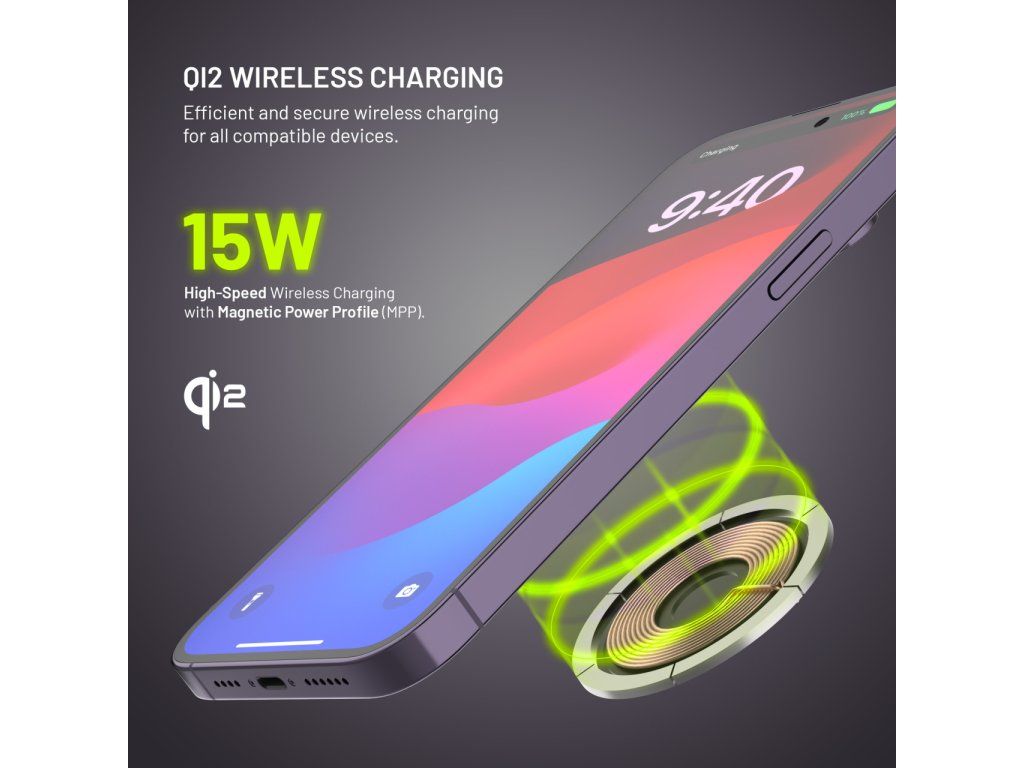 Nabíječka je určena pro bezdrátové nabíjení kompatibilních smartphonů s Qi2 nebo MagSafe. Stačí telefon přiložit k nabíjecí ploše, kde se magneticky přichytí a začne se automaticky nabíjet. Díky stojánku je ideální pro pracovní stůl, noční stolek nebo sledování obsahu během nabíjení.